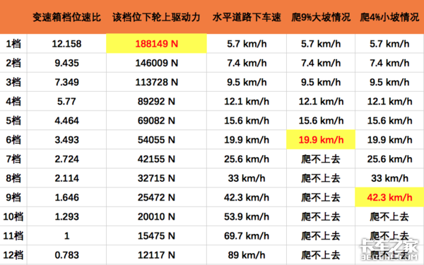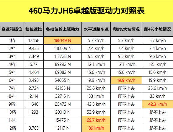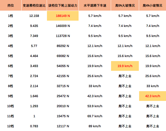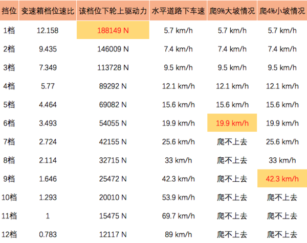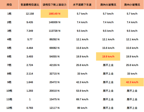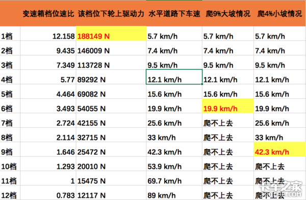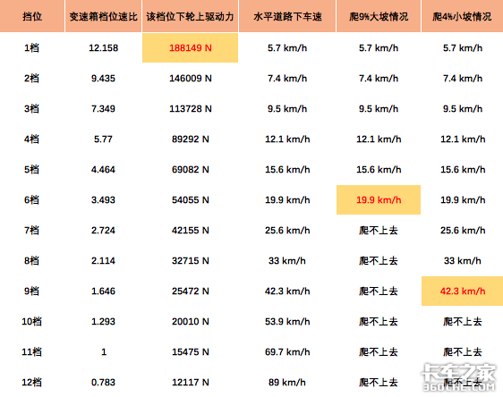 根据变速箱、发动机型号、后桥速比、轮胎尺寸,我们用卡车之家专业车速计算器计算可得,该车型在最高挡经济转速1300转时,时速可达89千米/时,头挡扭矩达188149牛米。