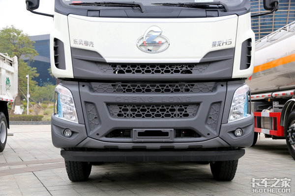 乘龙H5在外观上采用上白下黑设计,在颜色上形成了强烈对比。从中网位置开始,上方为白色涂装,整个下方一直延续到保险杠部分,则为黑色塑料材质。而该类车型一般以中短途运输居多,因此采用单卧铺、平顶驾驶室。
