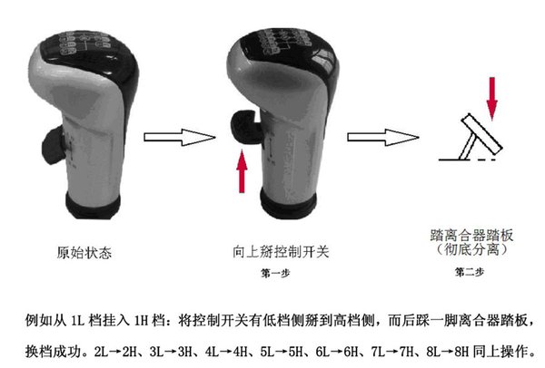 8挡换到9挡的操纵步骤:先将开关阀从4H切换到4L位置,然后踩下离合器,回空挡,然后向5L挡位置挂挡,挂上后,松开离合器,换挡过程完毕。其他挡位和降挡同样操作。