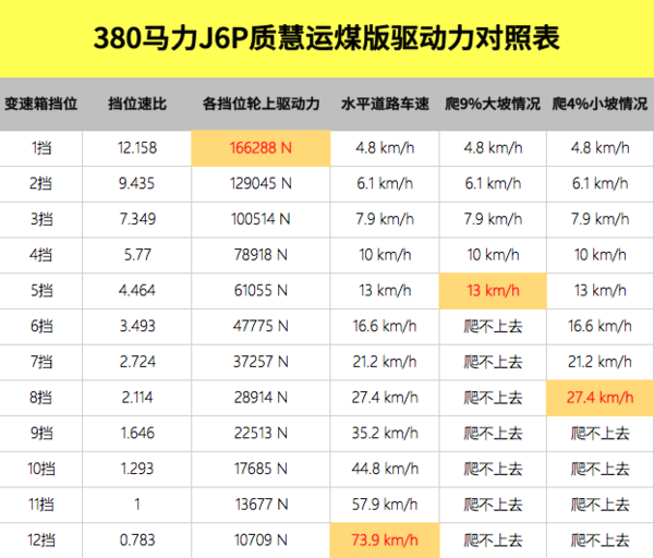 其实在看到这条J6P 380马力的数值时,相信许多卡友的第一感觉就是不够用,但通过扭矩分布图其实不难发现,其低挡位的驱动力相较于450马力左右的车型仅低了10%左右,挂次高挡照着1400转的转速开,顶着国道70的限速跑着还是很舒服,非常符合其倒短拉煤车的定位。