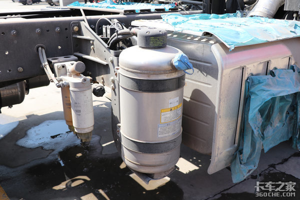 配件部分,解放J6P的气驱尿素与后处理放在了一起,由于是国六的车型,尿素罐的容积和后处理的体积都显得比较大。