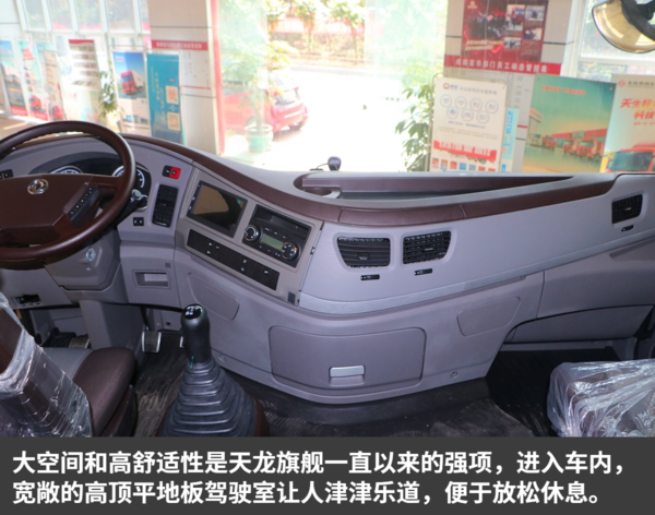 天龙旗舰驾驶室采用环抱式设计,中控操作区域偏向驾驶员一侧,功能按键布局上也是一目了然。配置方面,2020款天龙旗舰标配全景影像功能,带有7寸多媒体触控屏、自动空调、多功能方向盘、定速巡航、蓝牙、主副油箱切换、E/P(经济/动力模式)、差速锁、电后视镜加热及各种电源接口等。