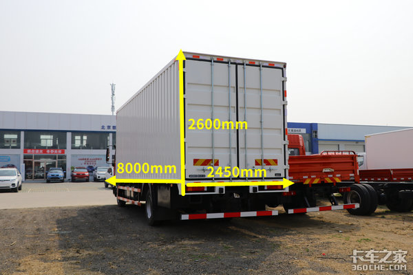 该货厢的长、宽、高分别为8000×2450×2600(mm)货厢容积达到了50方,这样的货厢尺寸可以很好满足大方量的装载需求。并且该货厢还带有侧开门设计,在装卸车时能将后门和侧门一同打开,装卸货效率能得到明显提升。
