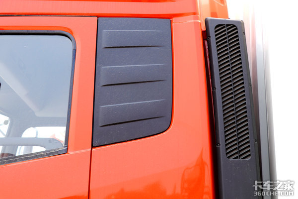 车身侧面,高顶双卧驾驶室加持能使车辆侧面更显挺拔。进气口被放置在了驾驶室后侧,进气口高度增加,能有效避免发动机吸入过多灰尘。