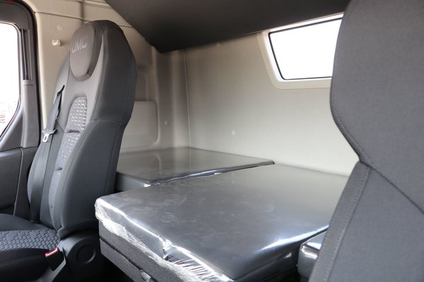 江铃威龙HV5燃气车为高顶双卧平地板驾驶室,驾驶室内部宽度达到2.5米,内部高度达到1.8米,空间也很充裕。下雨天休息时,车内伸展一下也是绰绰有余。