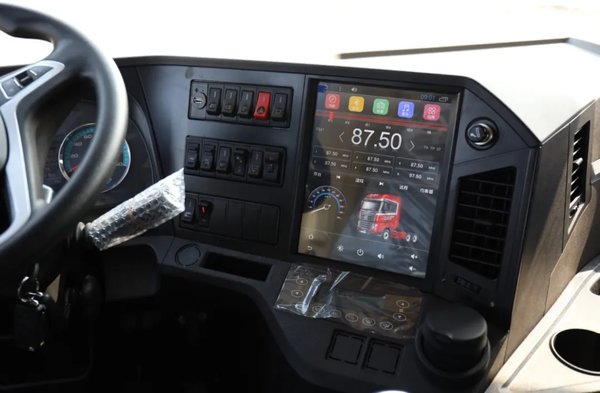 驾驶室仍然采用高顶平地板设计,内部也和其他车型没有太多变化,中控区的12寸超大多媒体触控屏十分抢眼,整体的智能化配置都体现和集中在了这块大屏上面。