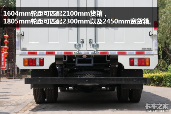 不同货厢宽度对应的轮距也不同,1604mm轮距可匹配2100mm货厢,1800mm轮距可匹配2300mm以及2450mm宽货厢,宽轮距匹配大货厢,可以提高车辆在急转弯时的稳定性。