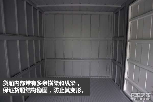 货厢的后门和侧门上方都采用了防雨设计,可有效防止门缝漏水,而且货厢内部带有多条横梁和纵梁,保证货厢结构稳固,防止其变形。
