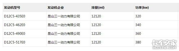 国五公告(HQC13105Q1S12E)新车搭载三一道依茨D12系列发动机 ,排量为12.12升,有435、462、490、517马力段可选。