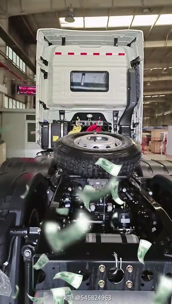 车身两侧并没有给尿素罐留出位置,可以看到,它被移到了驾驶室左后侧,体积很大,能够满足长时间使用。从视频中侧面可以看到,车桥应该是采用了免维护轮端,猜测还是康迈品牌。