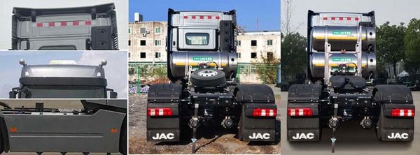 从图片上可以得知,该燃气牵引车驾驶室后面布置了一个气瓶,其实在车架的左右两侧还各有一个气瓶,也就是说,这台解放青汽JH6 4×2牵引车共配有三个气瓶。