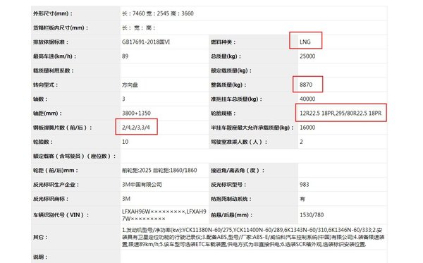 从公告详情当中我们获得了一些比较关键的信息——国六排放、5000mm轴距、少片簧设计,轮胎规格选择的是295/80R22.5 18PR。