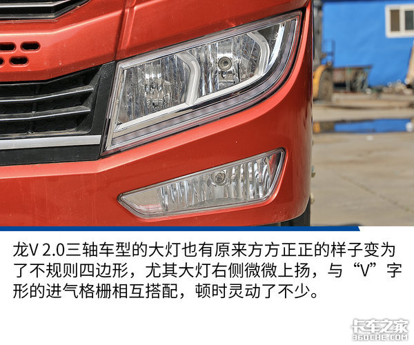外观点评:龙V 2.0三轴车型在外观方面,由于有了“猛禽”的加持,整体更加时尚年轻化,会受到更多年轻一代卡友们的喜欢。同时遮阳板、照地镜和大灯的设计优化,也会让卡友在日常行车时更安全、更舒心。