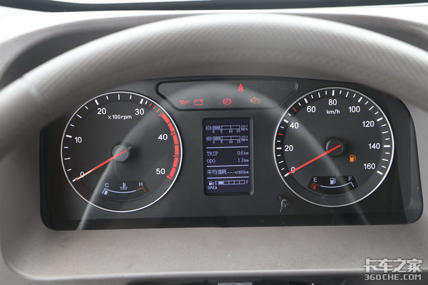 机械指针搭配液晶屏的仪表盘设计也更加趋向于乘用车化,黑底白字的样式,读取车辆信息一目了然。驾驶员可通过中间液晶显示屏,查询到车辆公里数、油耗以及气压等数据,便于随时了解车辆情况。