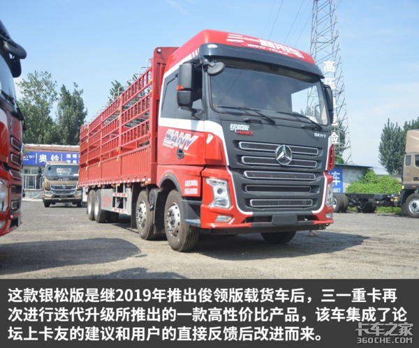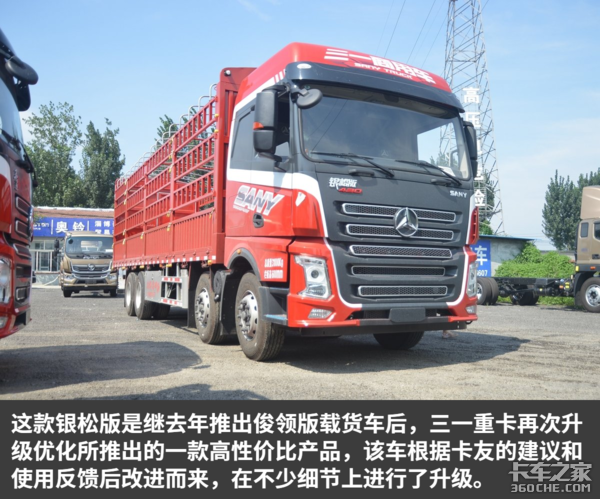 看到这辆三一银松板载货车的时候,仍然是熟悉的感觉,外观上基本与旗下牵引车保持一致,传承了家族式外观造型与设计特点。驾驶室同样还是高顶纯平地板设计,整体舒适性有所保障。俊领版和银松版这两款载货车,可以说支撑其了三一重卡的载货车品系。