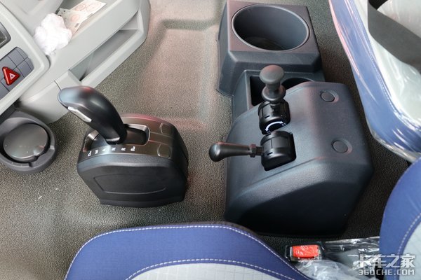 因为是AMT变速箱,驾驶室变速箱的操控杆是杠杆式设计,看上去很精致。挡杆设计与家用轿车非常类似,即使是第一次接触,也能很轻易的上手。操控杆紧靠主驾位置,占用的空间较小,至于挡位的话,前到后依次是Dm挡为前行蠕动挡、M挡为手动模式、A挡为前进挡、N挡为空挡、R挡为倒挡、Rm挡为倒行蠕动挡。