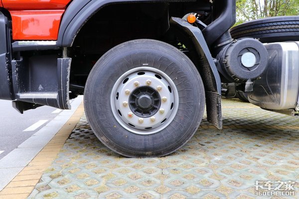 这款车的后桥采用457鼓式后桥,后桥速比4.444,采用了前2后3+3的钢板弹簧悬挂形式,油箱采用了铝合金的外壳,容积为400L,轮胎的规格为12R22.5。