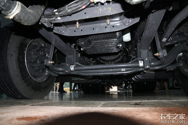 车桥方面,整车采用东风153前桥和方盛440后桥,后桥速比为2.643。前后桥均采用康迈免维护轮端,大大提高了车辆的出勤率。悬架方面,整车采用少片簧设计。