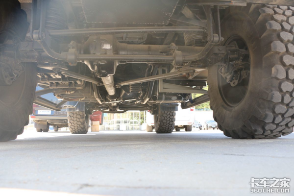 底盘最大的亮点是门式车桥技术,使得半轴轴端高于车轮中心线,提高了车辆的离地间隙,增强了车辆的通过性。