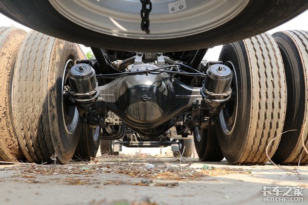 后桥为435冲焊桥,速比为3.727,在载货车里算比较小的速比,结合变速器超速挡0.783的速比,总速比为2.91,配合400匹大马力发动机,在平原高速上能快到飞起,而且还省油。