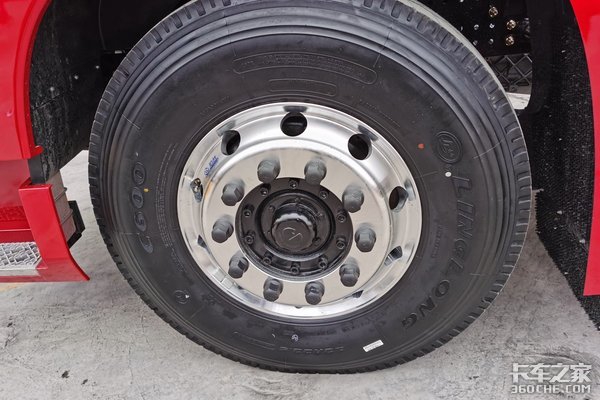 这款车的油箱采用铝合金壳体,容量为800L,相较于之前四款车稍显逊色。实拍车的轮胎来自玲珑轮胎,轮胎的规格为12R22.5。