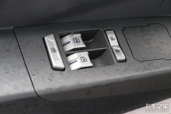打开车门,门板颜色以黑色为主搭配了部分银色点缀,开门把手的后部做了延伸设计,加强了整体感。但是下方的储物格尺寸比较偏小,无法放下一瓶正常尺寸的饮料,感觉有点遗憾。门板上的按键均为异型塑料材质,这样的设计也是在轻卡之上首次出现,颇有特点。