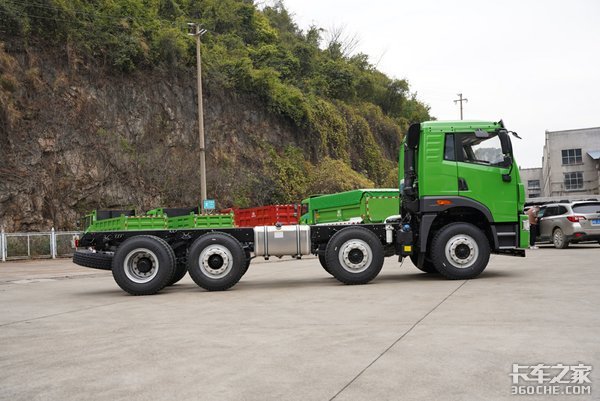 底盘是这台悍V自卸的最大亮点,这台悍V采用8x2的驱动形式,1、2轴为转向轴,3轴为提升桥,4轴为驱动轮。