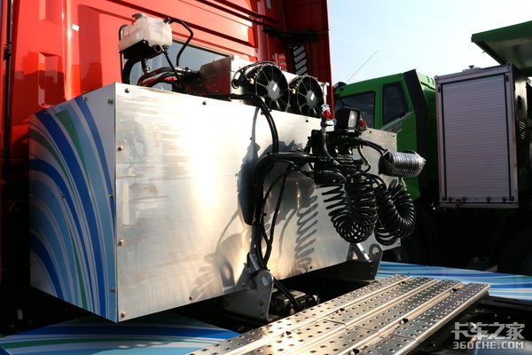 驾驶室后方,这台车布置了一套完整的水冷机组来负责给电池进行降温,整体的走线以及位置做的还是相当不错,要知道整套电池组在正常运转时会产生非常大的热量,如果散热不好很容易造成车辆的电路系统损坏。