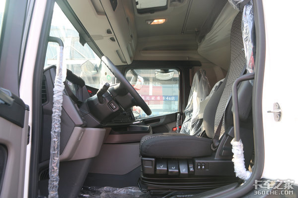 整车采用了气囊式的座椅,表面为织布的材质,这种材质相比于皮质的好处在于冬天不冻、夏天不烫。主驾座椅的高低前后、软硬俯仰皆可调节,在此基础上还提供了腰部和背部的支撑调节,最大程度缓解卡友们长途行车的疲劳感。同时配有后桥气囊悬架的遥控器,站在车下也可操作,安全便利。