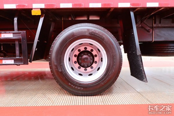 整车装配规格为295/80R22.5的朝阳牌真空胎,采用铝合金轮辋,相比普通的钢质轮辋重量更轻,有利于节省燃油。两条前轴均采用康迈免维护轮端,可大幅延长换油周期,降低维护成本。