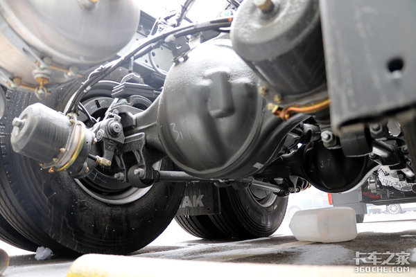 后桥采用的同样是重汽自主的12吨级后桥,型号为MCY12BGS,速比为3.7。另外车辆采用了V型推杆设计,这也能够让车辆保持更好的行驶稳定性,同时我们也能发现整车线路走线还是非常规整的,让人看起来很舒服。