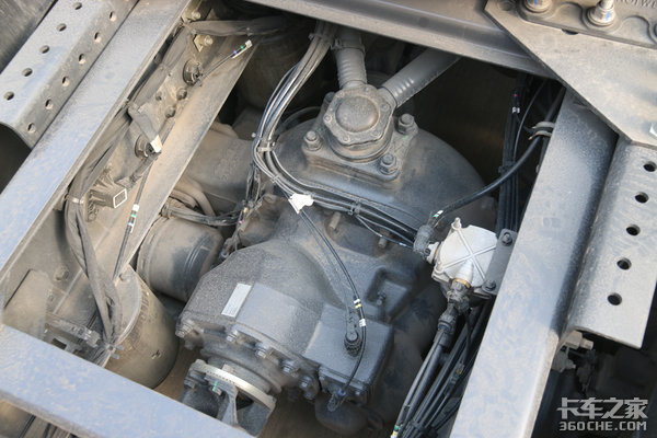其原理是在两个驱动桥之间增加了一套爪式离合器,主要负责两条车轴之间的动力接合与脱离。当我们放下车桥时,会结合离合器,将提升桥驱动轴进行连接。而当我们提升后桥时,则脱离动力传递。虽然这样车桥会重上不少,但相较于6x2提升来说,6x4提升在总质量上又多出了3吨,驱动力也更强了,相信不少卡友也会很青睐这个配置。