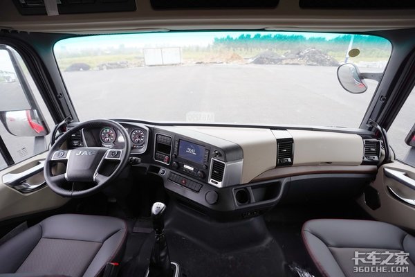 内饰方面,这款江淮格尔发A5X相对来说就显得高档一些,高顶双卧平地板的驾驶室保证了驾乘空间的宽敞,支持多项调节(通风加热、两级腰部支撑)皮质包裹的气囊座椅搭配上四点气囊悬浮悬挂的驾驶室保证了驾乘时的舒适度,(仿)皮质包裹的工作台保障了驾驶室的观赏性。