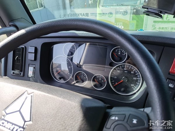 方向盘后方的仪表盘也是重汽最常见的6表指针式。常见的转速、时速、油量、气量、电池电压、水温都一应俱全。