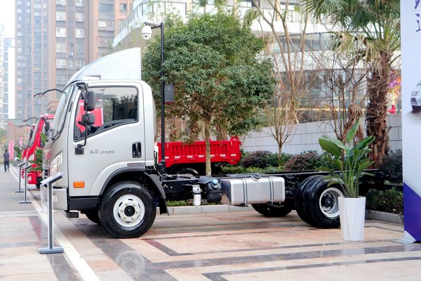 该车的车身尺寸为5995x2400x2550mm,轴距为3300mm,可以装配一个尺寸为4100x2250x400mm的栏板货箱。