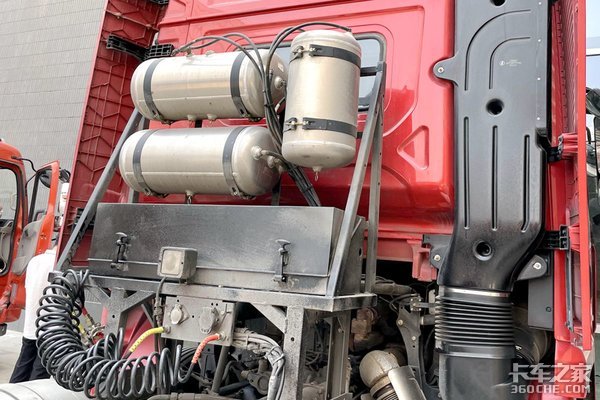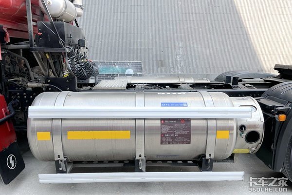 这辆LNG牵引车的两个气瓶加在一起的续航里程轻松达到1200公里,不过这也是有代价的:为了实现双气瓶和超长的续航里程,这款牵引车的其他部件作出了很多妥协,有些放到了车架内侧,有些放到了驾驶室后面。