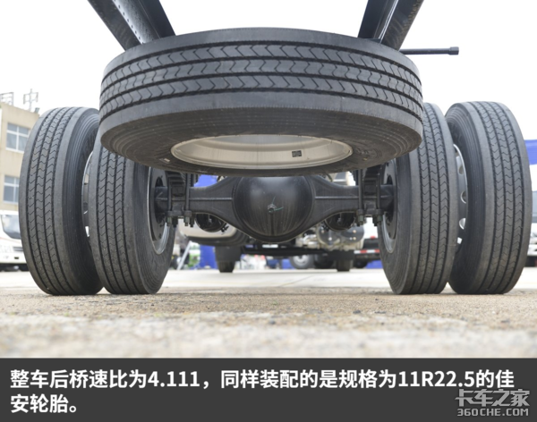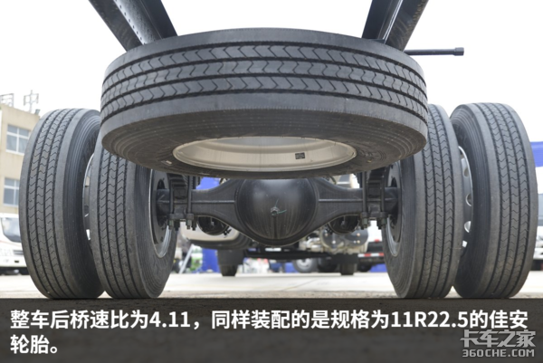 整车后桥速比为4.111,同样装配了规格为11R22.5的佳安轮胎。根据发动机转速、变速箱挡位速比、后桥速比和轮胎型号,通过卡车之家车速计算器可以得出,这款大黄蜂Home版在1300转的经济转速下车速可以达到76km/h。