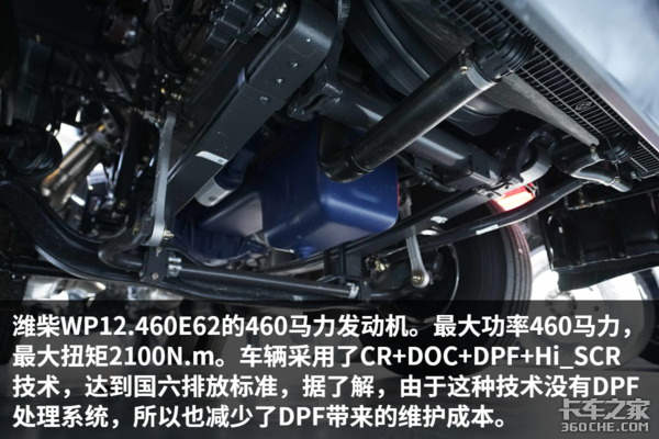 动力方面,这款定制版的乘龙H7选择的是潍柴WP12.460E62的460马力发动机。最大功率460马力,最大扭矩2100N.m。车辆采用了CR+DOC+DPF+Hi_SCR 技术,达到国六排放标准。