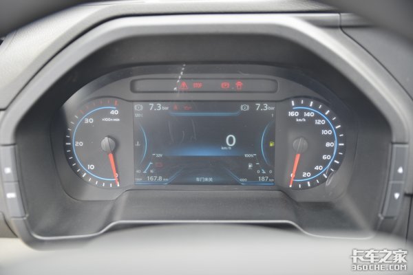 仪表盘区域采用机械指针+7寸液晶屏的组合,中间的液晶屏视觉效果非常炫目,用户通过液晶屏可以清晰地获取到车辆的行驶里程、油量、油耗、车速等关键信息和各种警示信号。细心的卡友一定会注意到,仪表盘两侧的边框上也设计有切换按键,进一步增加了档次感和可玩性。