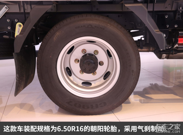 实拍这款车装配规格为6.50R16的朝阳轮胎,采用气刹制动,相比液刹其结构虽然更复杂,成本更高,但同时也拥有制动反应快、刹车力度大等优点,更能保证制动安全,对于经常行驶在山区城乡路况的卡友来说,制动配置方面建议选择气刹。当然,HOWO智相小卡也有液刹版本供大家选择。