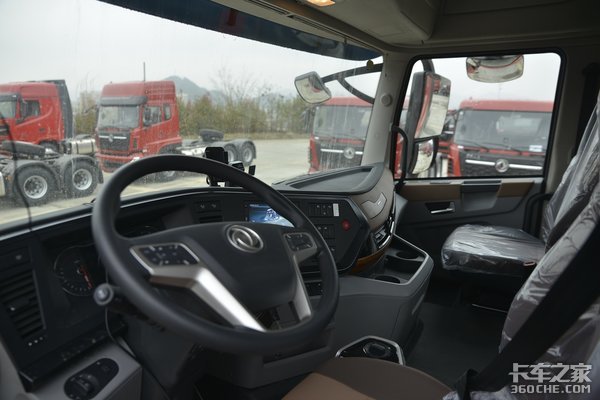 实拍的这款东风天龙旗舰KX装配有一高顶双卧平地板驾驶室,驾乘空间都非常宽敞,四点气囊悬浮的悬挂形式可以很好的保证车辆在经过颠簸路段时的平稳性。