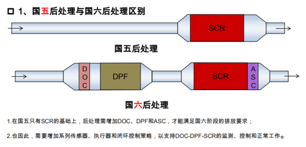 后处理增加的东西大家都比较清楚了,其中最主要的就是DPF,DPF颗粒捕捉器配合DOC使用,可以减少尾气中的颗粒物,现在国六排气管依次是DOC-DPF-SCR-ASC四个部分。