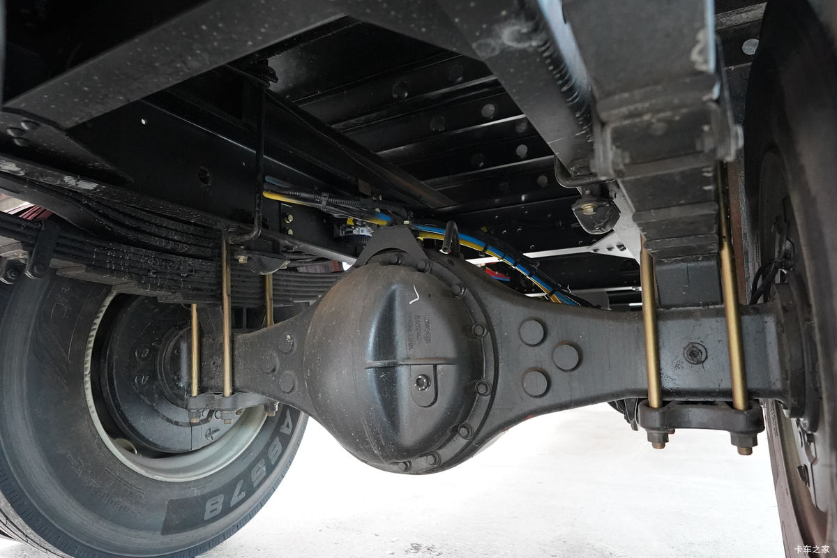 实拍车使用了378铸造桥,速比为4.33。为了确保自身的承载能力,该车采用了多片簧设计,钢板弹簧片数前7后7加3,轮胎尺寸为275/80R22.5。这一套底盘、动力链搭配下来,通过卡车之家车速计算器得出,当发动机处于经济转速1300-1700rpm之间时,车速可达到70-98km/小时,时效性有保障。