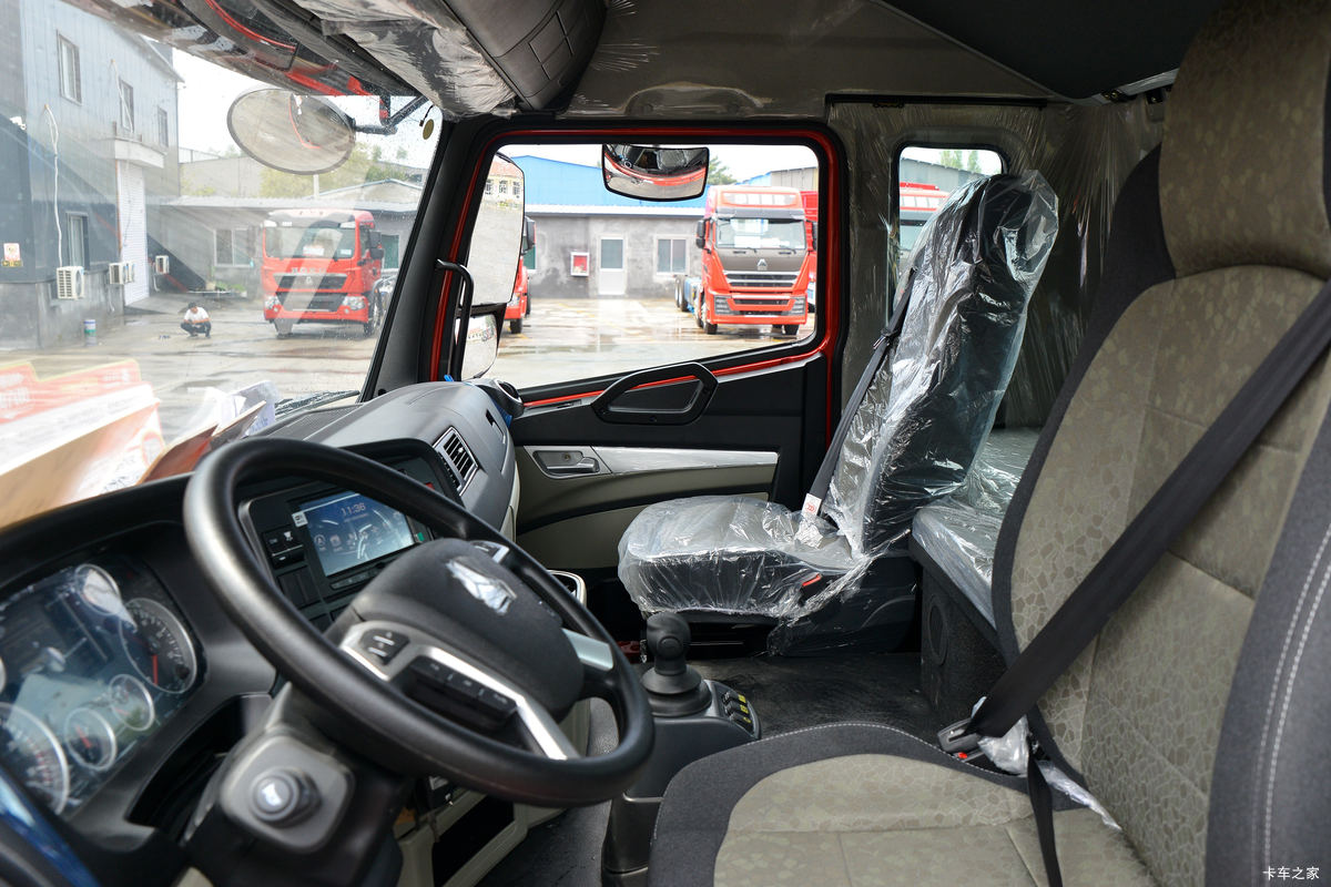 这款HOWO N5G虽然不是平地板驾驶室,但是空间同样非常大。舒适性配置方面,实拍车装配有支持多项调节的织布包裹气囊做一,功能性配置方面,类似于多功能方向盘、可满足卡友们日常影音娱乐需求的中控屏等均有装配。车辆的AMT变速箱操作感采用球状设计,握感非常棒。