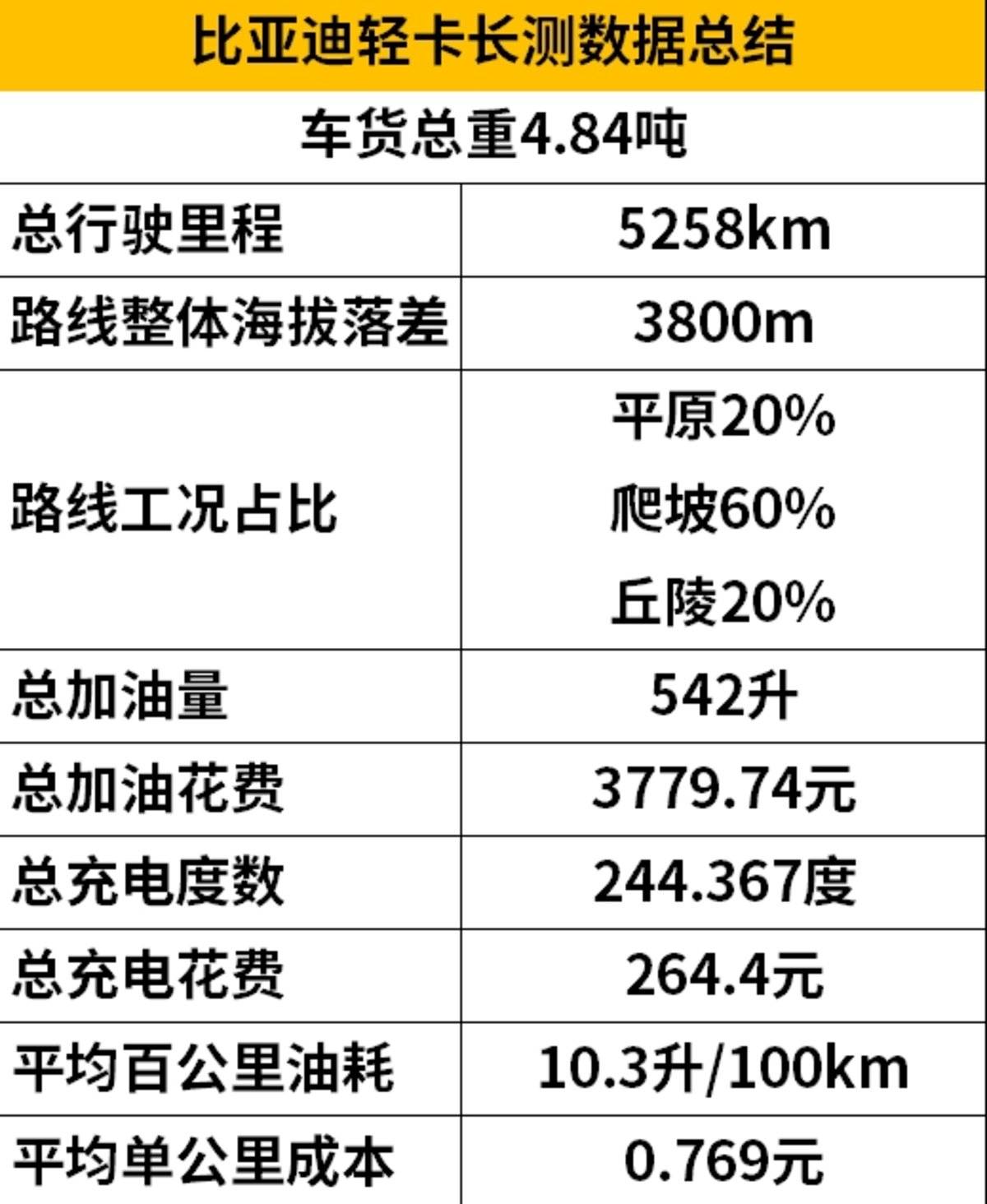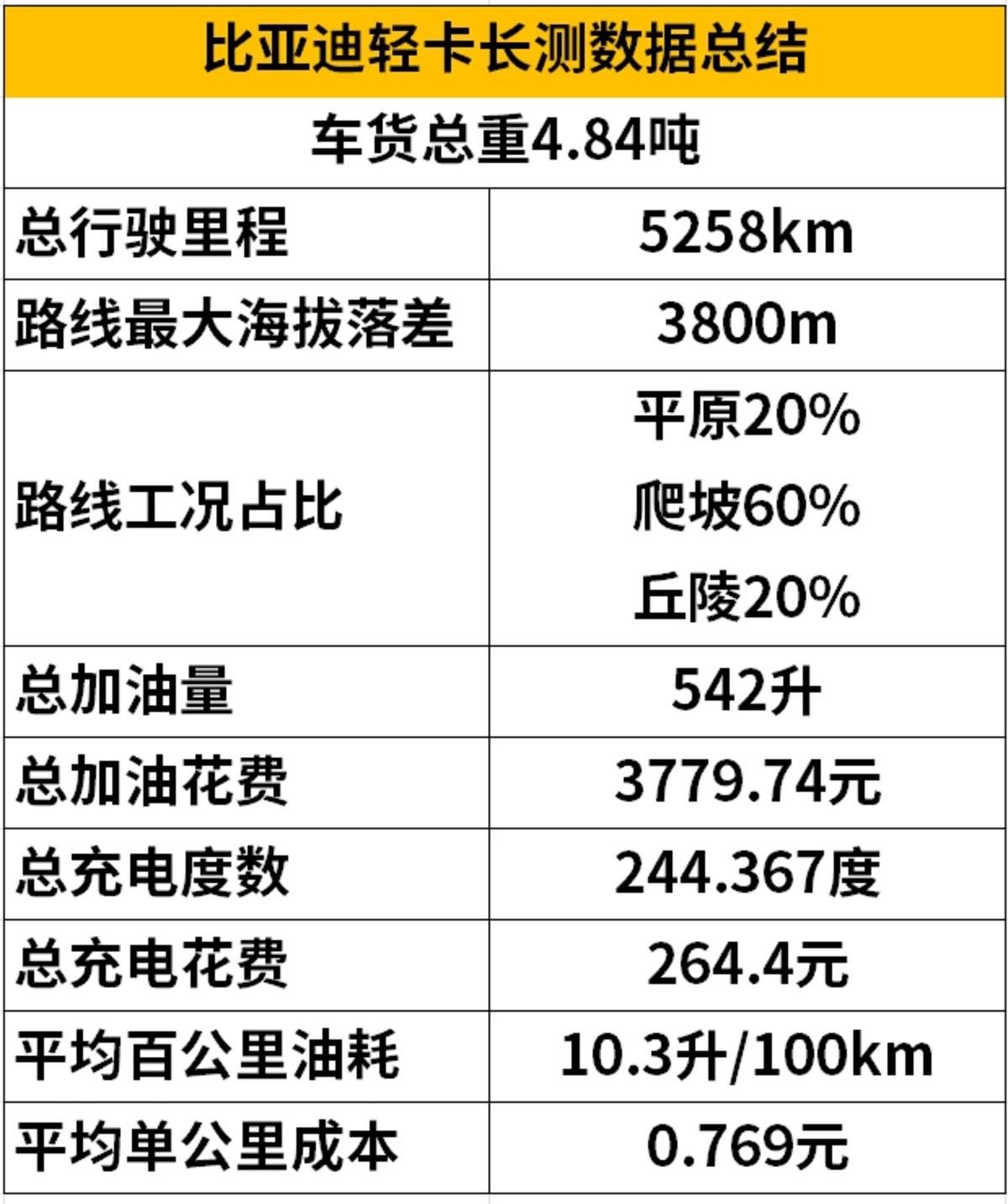 本次我们共行驶了5258公里,累计加注542升燃油,平均百公里油耗为10.3升,单公里成本为0.76元。尽管油耗与我们之前的测试相比有所增加,但这也是在经历了3800米的海拔落差、不断爬坡和超车后得出的结果。整体来看,对于一台混动轻卡而言,面对5200公里的超长运距和极复杂的工况,其燃油经济性和成本控制表现依然非常不错。