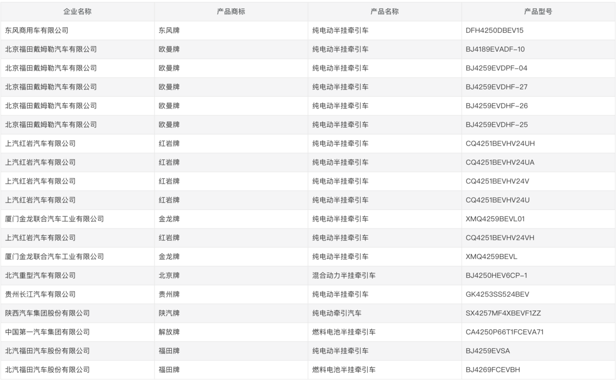 虽然在公告中,并没有详细的电量信息,但是这5款牵引车中,有一款整备质量最高为13.8吨,另一款整备质量最高为14.6吨,从自重上可以猜测应该匹配了大电量电池包。