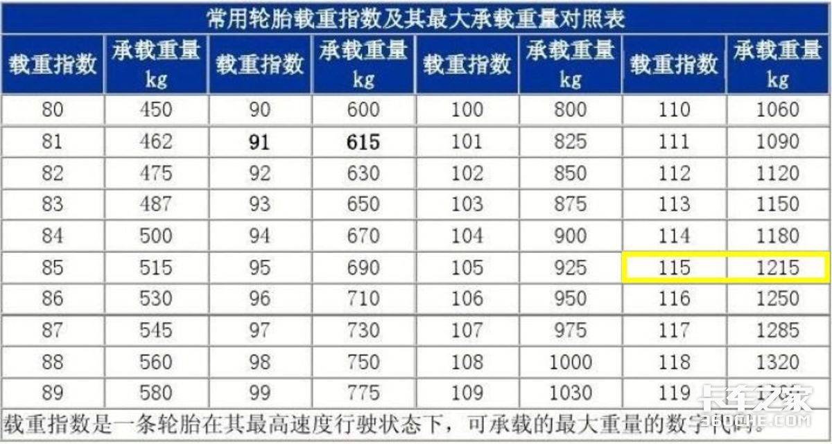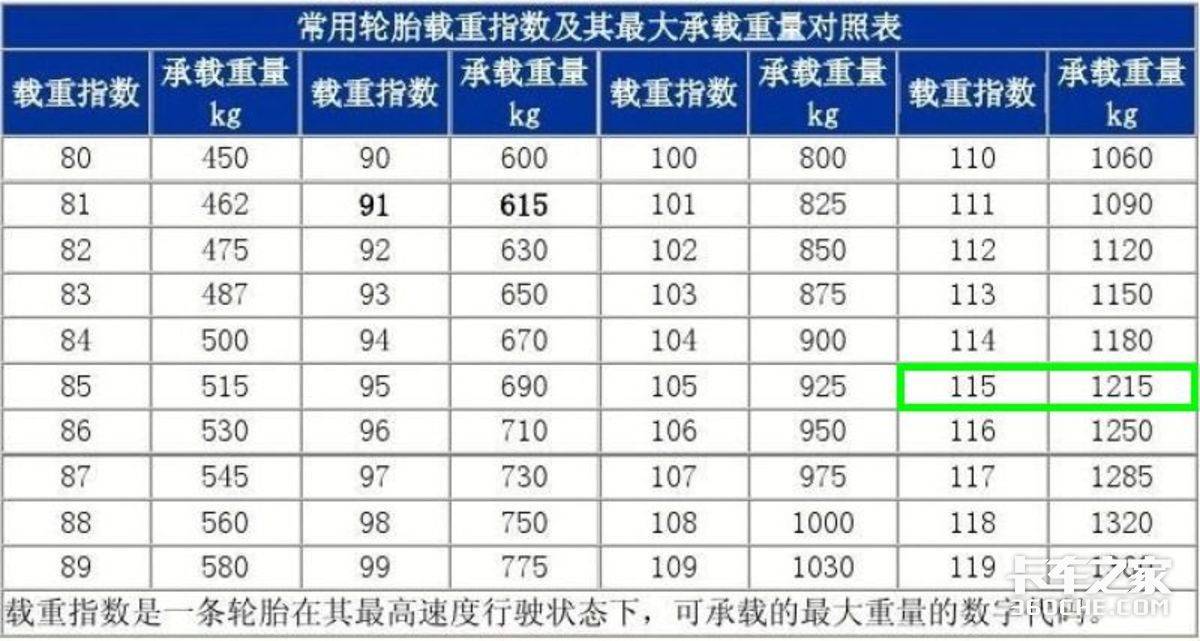 载重指数是轮胎的关键安全参数,表示轮胎在标准气压下能够承载的最大负荷。根据轮胎载重指数对照表可得,12R22.5轮胎在标准气压下,单胎使用时轮胎最大负荷为3550千克,双胎使用时每轮胎最大载荷为3250千克。必须根据车辆总重选择合适指数的轮胎,严禁超载才能确保安全。